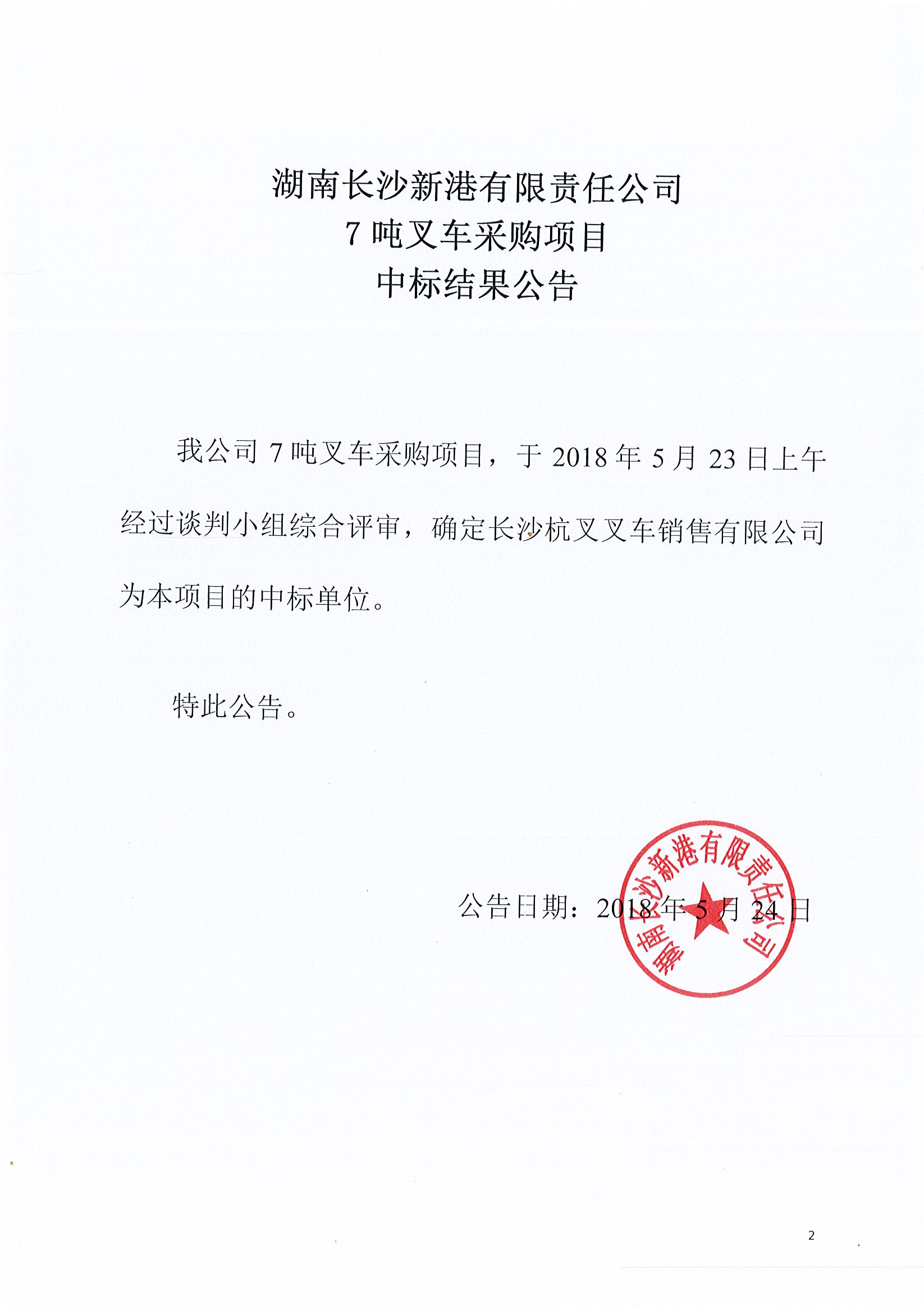 湖南長沙新港有限責任公司 7噸叉車采購項目中標結果公告