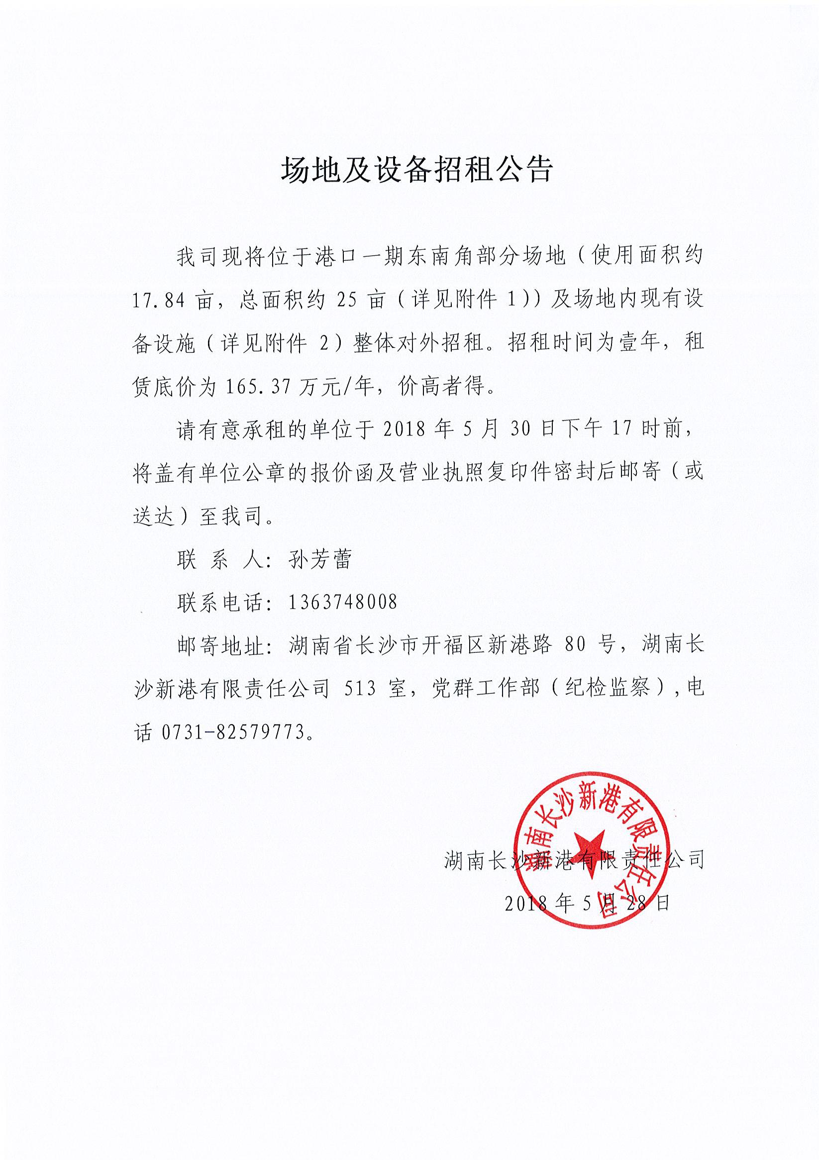 湖南長沙新港有限責任公司 場地及設備招租公告