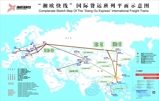 在長沙鐵路貨運新北站,來自湖南省內及江西等省份的貨物集中于此,電子產品、鞋服等出口貨物裝上中歐班列(長沙),不到20天就能抵達歐洲。圖為湘歐快線最新線路圖。 10月16日,從北京傳來好消息,第五屆中國國際物流發展大會將于11月16日至17日在長沙舉行,這是該會議首次落子中部地區。屆時將邀請來自全球70多個國家和地區的物流行業專家等千余人參加,圍繞“一帶一路”倡議建設相關產業等重點領域的痛點進行交流與探討。 大會為何會選擇移師長沙,物流行業大咖為何紛紛前來這座文化古城進行交流并尋找商機。長沙又是用怎樣的優勢來吸引物流“大咖”的目光?現在不妨跟隨紅網時刻記者一起感受下長沙物流的魅力吧。 開放物流:全面推進長沙東部地區“通江達海” 近幾年,中央提出“一帶一路”“長江經濟帶”兩大發展戰略,湖南立足“一帶一部”定位提出了“創新引領、開放崛起”戰略,省會長沙規劃建設“東部開放型經濟走廊”……這些戰略的出臺都在昭示著物流“開放”的重要性。 2018年9月,長沙市發改委下發的《長沙東部開放型經濟走廊發展規劃(2018—2025)》(簡稱《規劃》)序言中的幾句話,道出了長沙交通物流的魅力所在,也道出了對長沙推動東部開放型經濟走廊建設的展望。 打造東部開放型經濟走廊是長沙實現“開放崛起”戰略的重大部署,也是其向東發展的展望。這個位于長沙東部地區的經濟走廊被定位為長沙全面建設現代化的開放引擎、湖南全面融入長江經濟帶的戰略支點、湖南發揮“一帶一部”功能的核心樞紐和內陸地區開放創新的示范高地。 根據《規劃》,長沙東部開放型經濟走廊規劃形成“一核(三翼)三軸七組團”的空間布局。值得一提的是,主走廊“一核三翼”的城鄉空間布局,即以臨空經濟示范區和長沙新港為核心區。 《規劃》提出,主走廊重點發揮航空城、高鐵會展新城、長沙新港所包圍的核心區的極化作用,加速發展臨空、臨鐵、臨港經濟,全面推進長沙東部地區“通江達海”戰略。 其中,航空城增長極以航空城為核心,高鐵會展新城增長極要發揮高鐵南站交通樞紐優勢,長沙新港增長極,要依托長沙新港、長沙北站、金霞保稅物流中心、銅官港區,搭建水路、鐵路、公路型物流平臺,打造“現代化區域性國際物流中心”。規劃將湘陰漕溪港和岳陽城陵磯作為長沙深水外港,將上海崇明港作為深水“飛港”,將長沙港打造成專業化運輸核心港區和全國內河主樞紐港口,構建通江達海的現代化內河水運系統。 金霞魅力:水、鐵、公聯運,物流更順暢