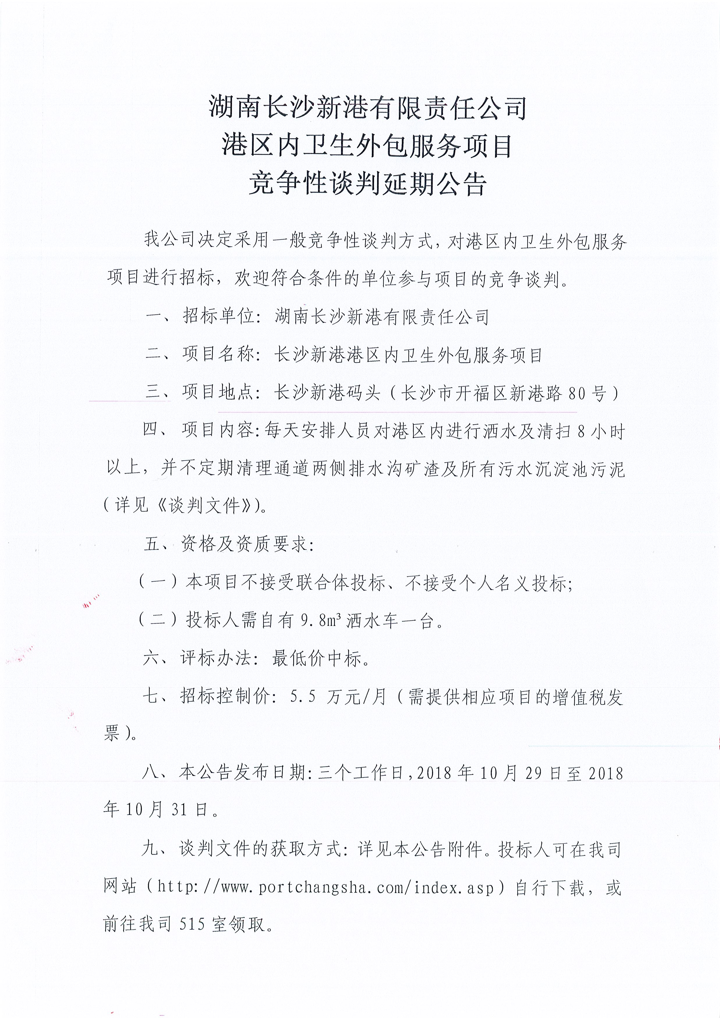 湖南長沙新港有限責任公司港區內衛生外包服務項目競爭性談判延期公告
