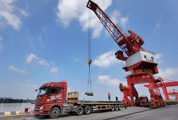 近日,記者在長沙新港碼頭看到,碼頭泊位停滿貨船,起重機不停地將貨物從船上卸到拖車上,拖車在堆場與碼頭間川流不息。