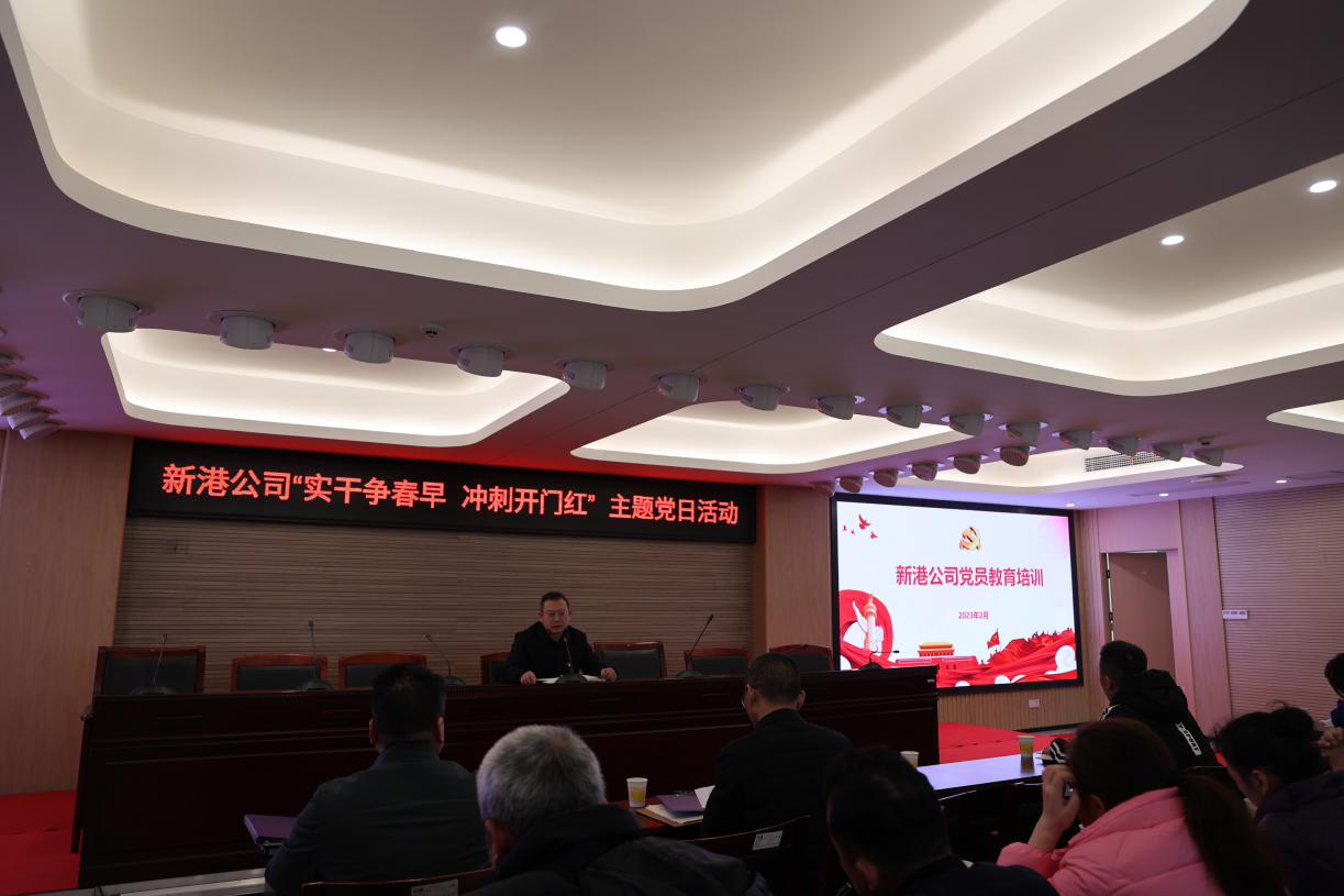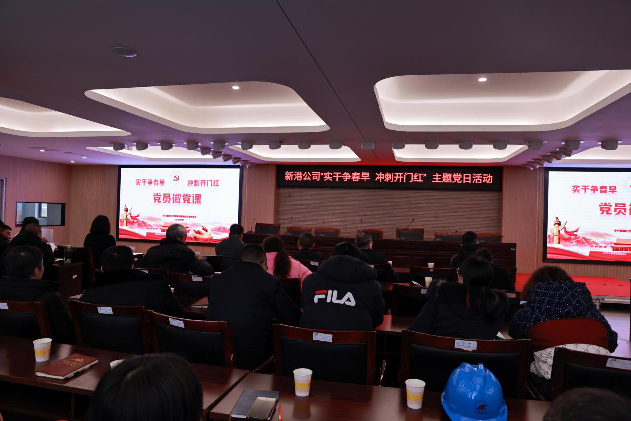 實干爭春早 沖刺開門紅 中共湖南長沙新港有限責任公司委員會主題黨日活動 為扎實擔當起學習宣傳貫徹黨的二十大精神排頭兵的光榮使命,教育引導廣大黨員干部從黨的二十大專題學習汲取精神力量,在新的一年里,進一步堅定理想信念,主動肩負時代重任,開啟新征程。2月17日上午,長沙交通集團新港公司開展學習貫徹黨的二十大精神“實干爭春早,沖刺開門紅”主題黨日活動,此次活動,以“微影片、微黨課、微實事、黨員教育培訓”等多種形式推動黨的二十大精神落地見效。公司黨委副書記、董事、總經理辛華作宣講,班子成員、公司中層管理人員、各支部黨員共76人參加活動。 深學悟初心-【微影片】 全體黨員干部集中觀看2022年度湖南反腐警示片《忠誠與背叛》。通過觀看警示教育片,引導黨員上好廉潔教育“新年第一課”,教育全司廣大黨員干部面對誘惑要保持清醒的頭腦,自覺抵制各種腐敗現象的侵蝕,牢固樹立正確的人生觀、利益觀和權力觀,干干凈凈做事,老老實實做人。  篤行求實效-【微黨課】 學理論之思,踐初心之行。新港公司以“實干爭春早,沖刺開門紅”為主題,從七個黨支部里的推選黨員干部帶頭講,鼓勵黨員人人上臺講【微黨課】,突出“微”這個形式,聚焦“黨”這個靈魂,利用“課”這個載體,教育廣大黨員從不同層面、不同角度深刻領會黨的理論創新成果,以新思想、新觀念、新思路、新舉措,開創公司高質量發展新局面。