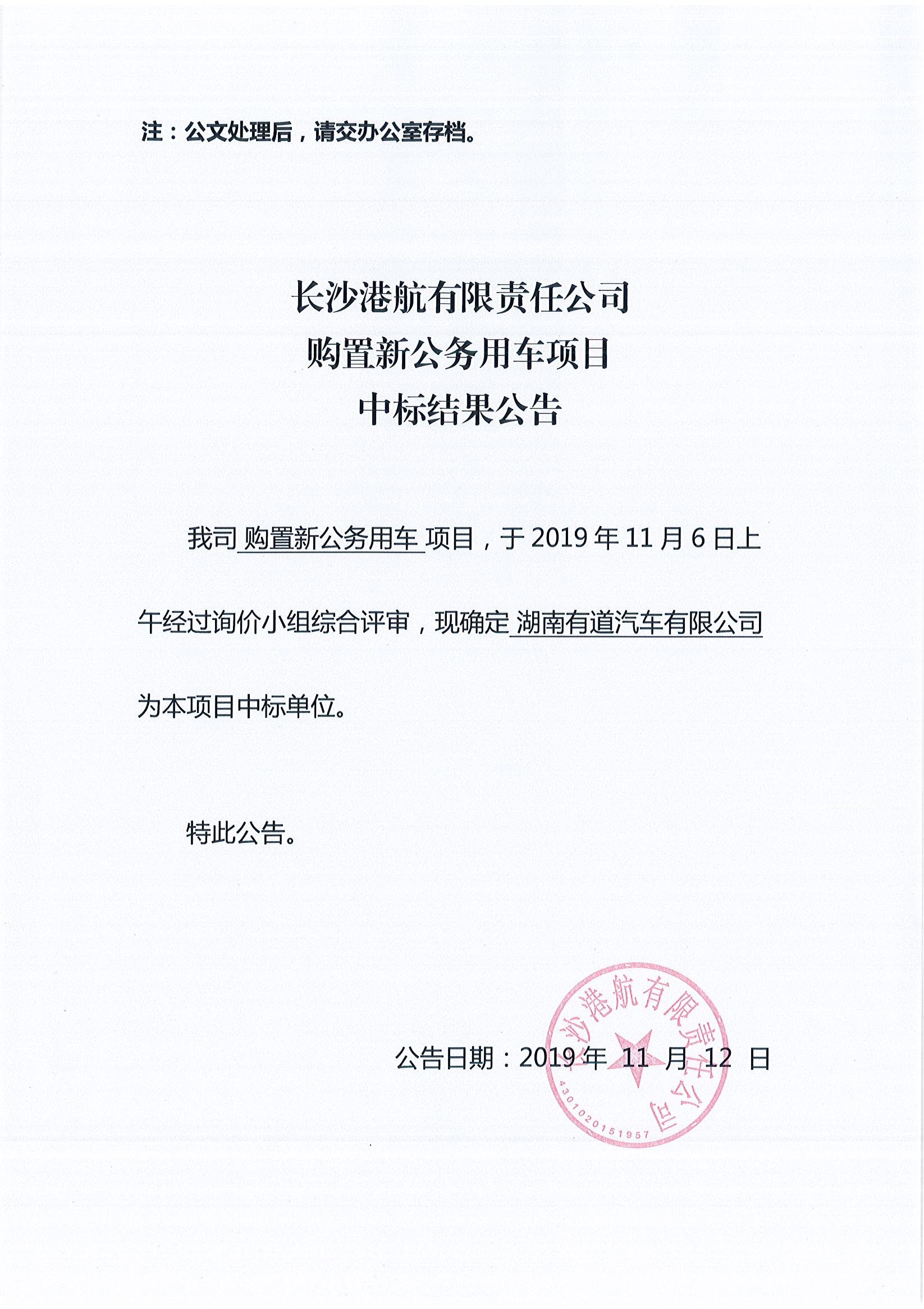 長沙港航有限責任公司購置新公務用車項目中標結果公告