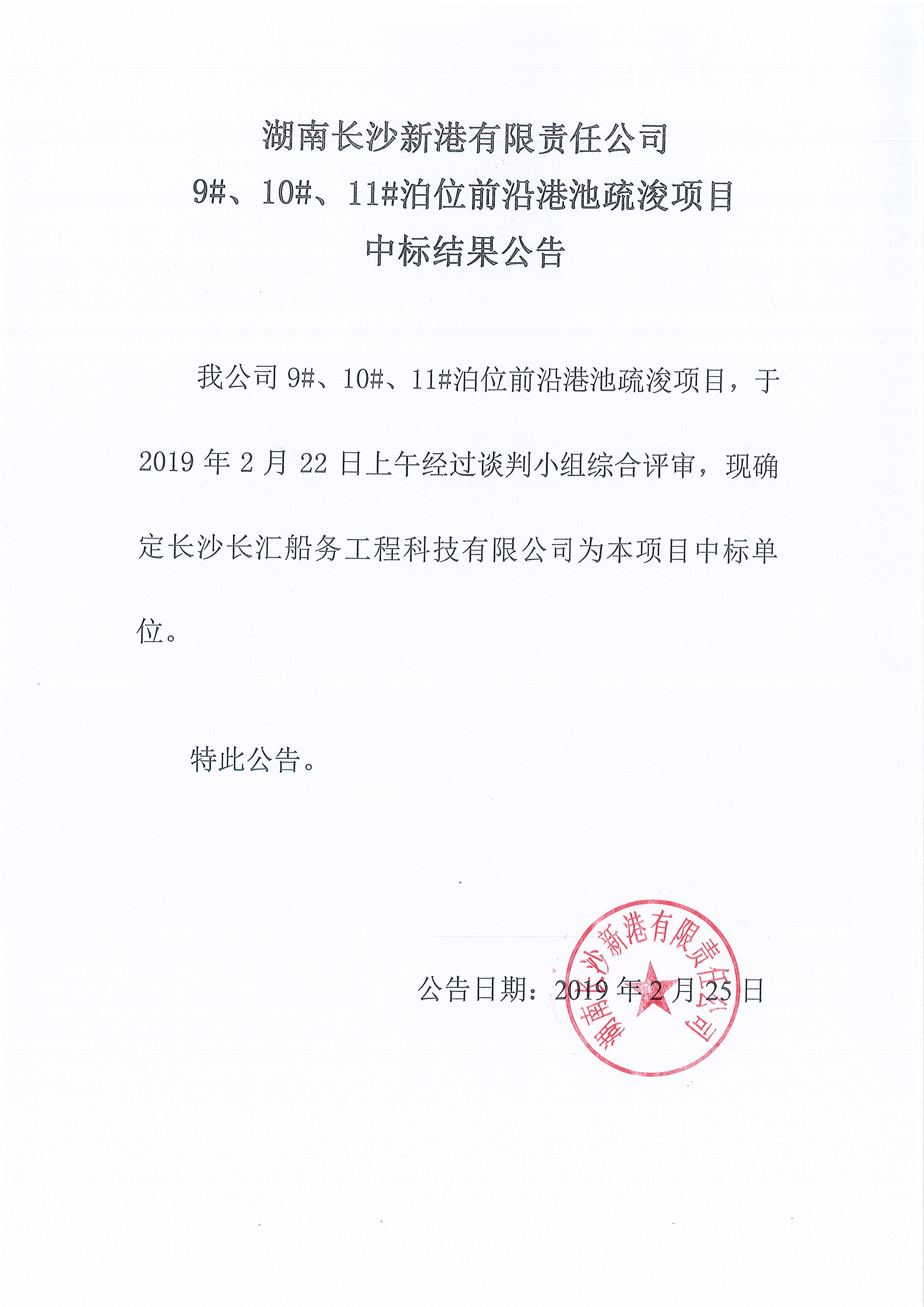 湖南長沙新港有限責任公司 9#、10#、11#泊位前沿港池疏浚項目中標結果公告