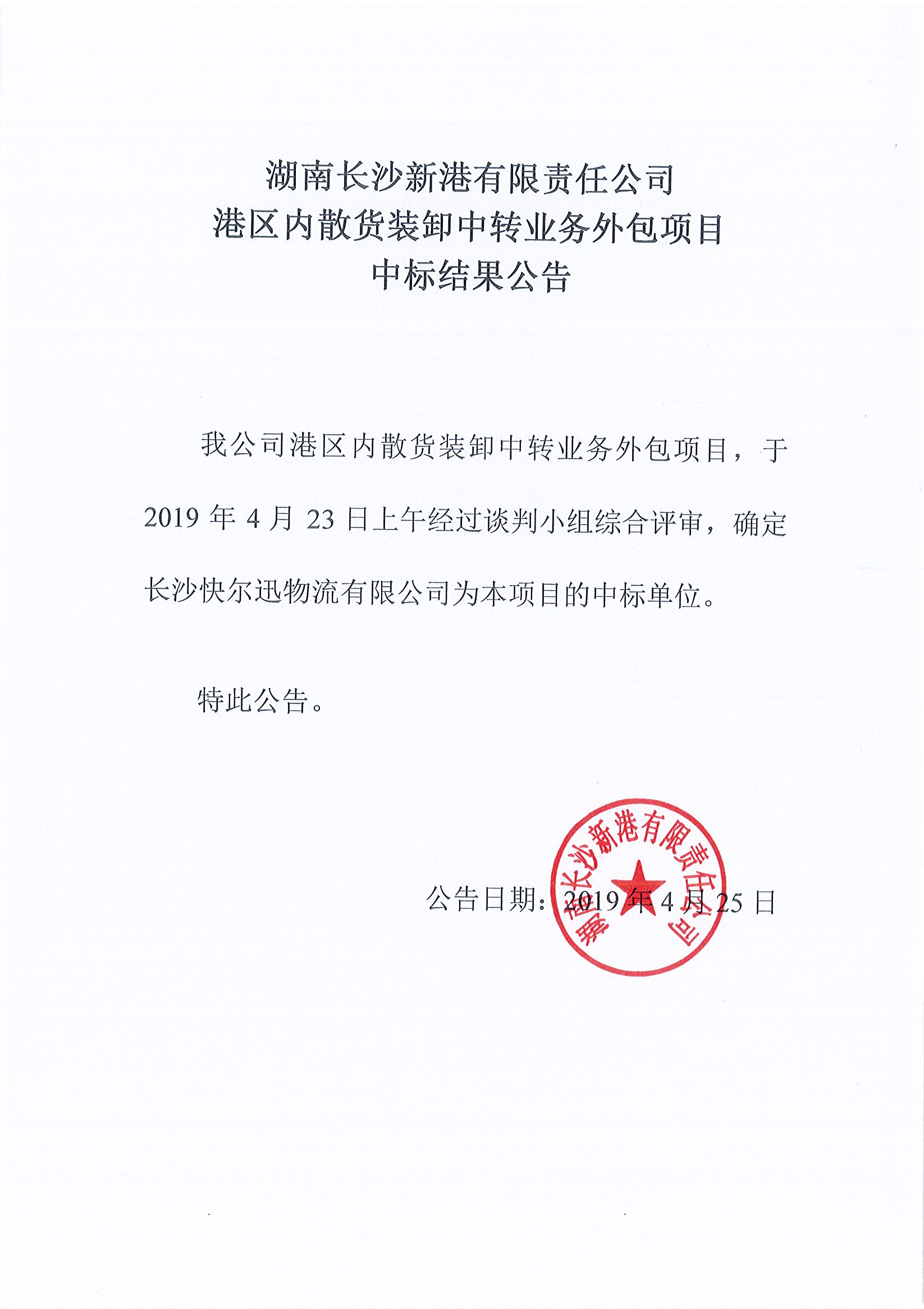 湖南長沙新港有限責任公司港區內散貨裝卸中轉業務外包項目中標結果公告