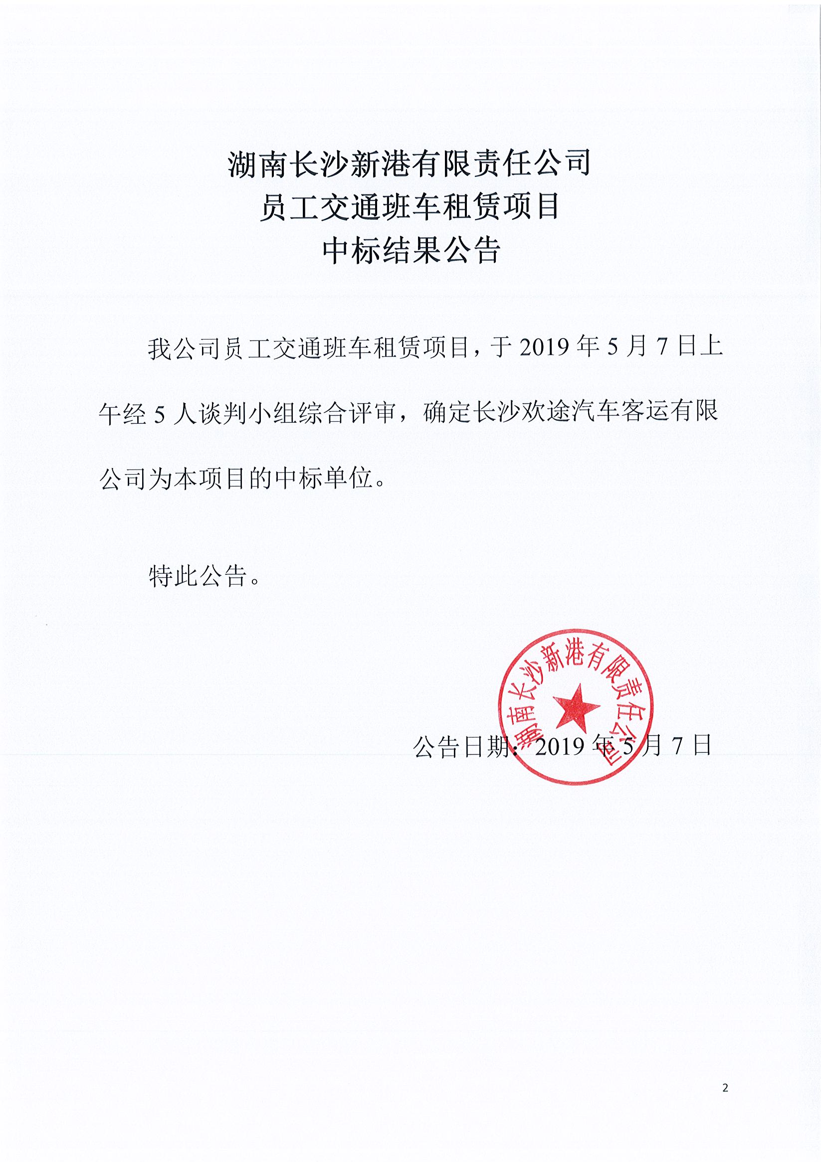 湖南長沙新港有限責任公司員工交通班車租賃項目中標結果公告