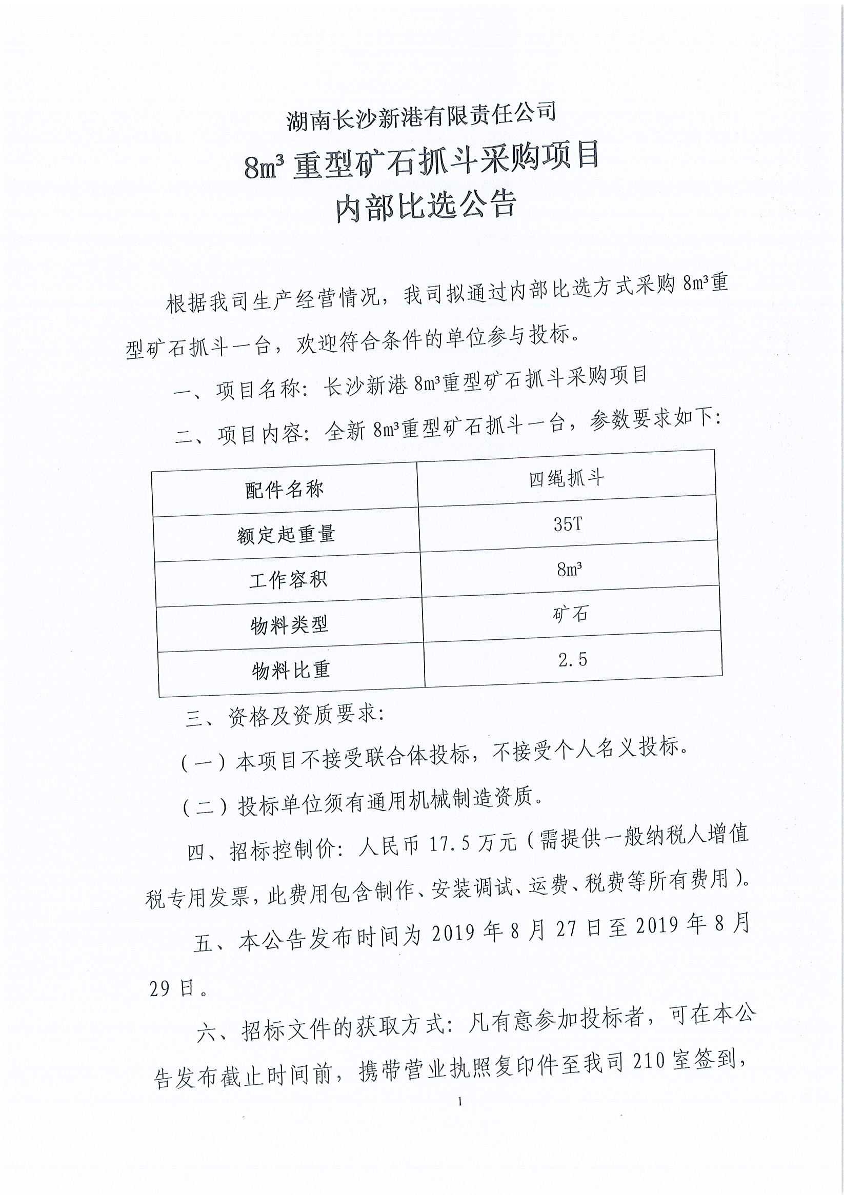 湖南長沙新港有限責任公司8m³重型礦石抓斗采購項目內部比選公告