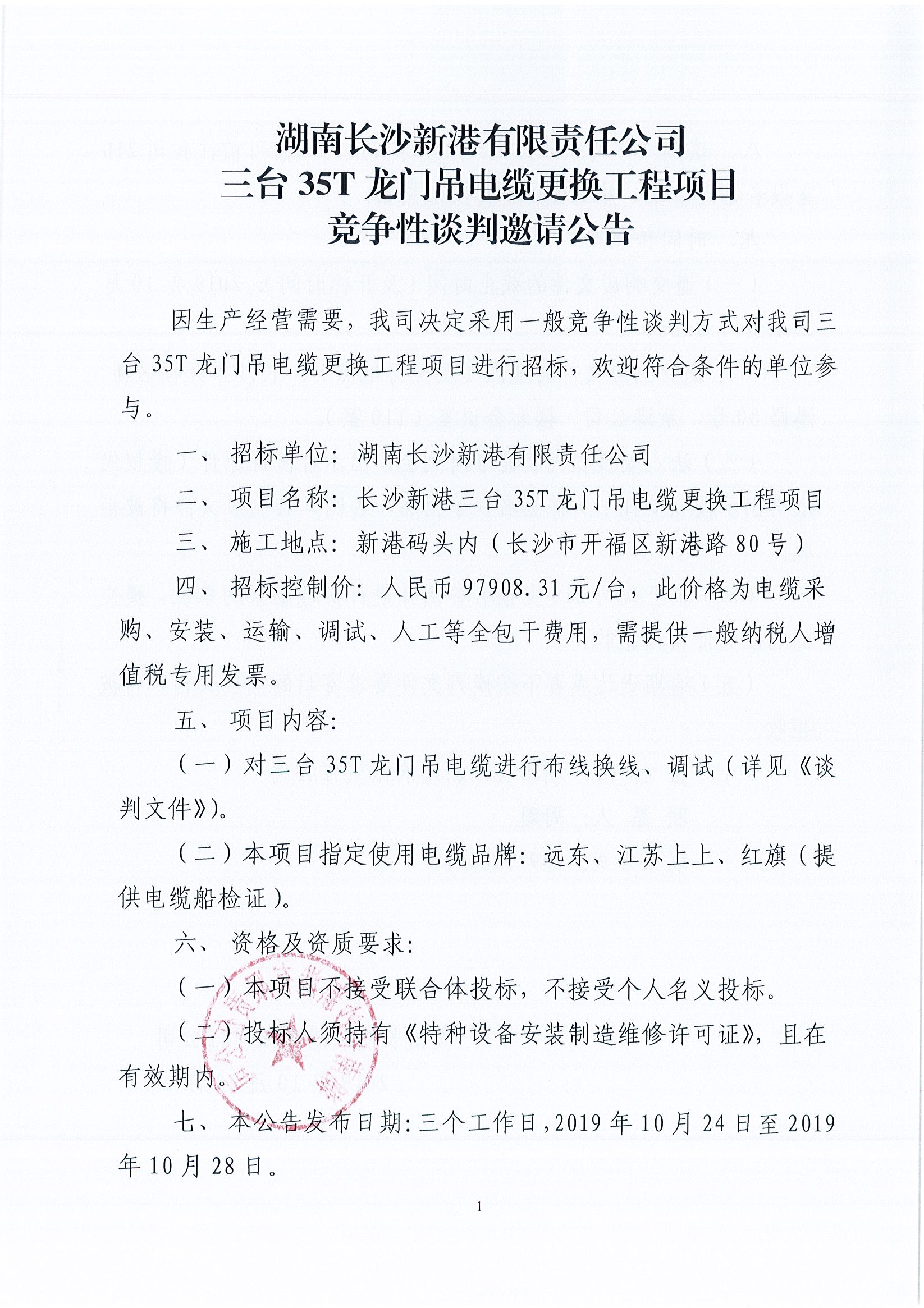 湖南長沙新港有限責任公司三臺35T龍門吊電纜更換工程項目競爭性談判邀請公告