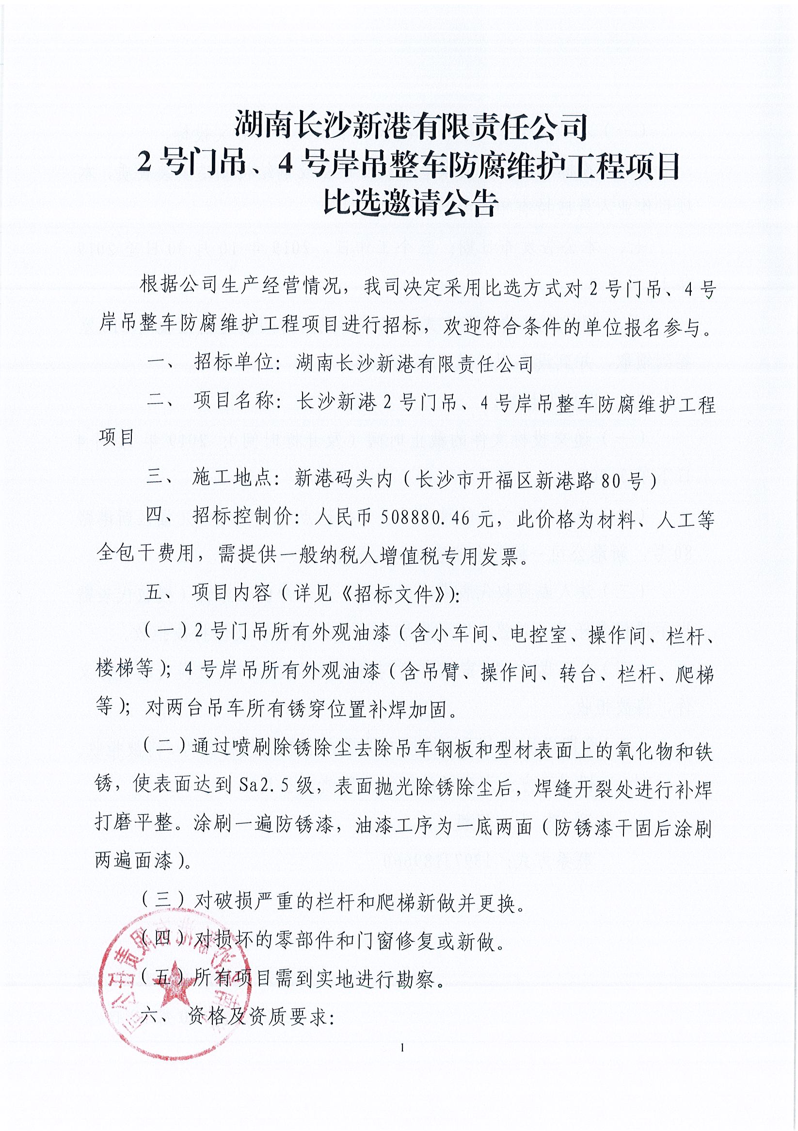 湖南長沙新港有限責任公司2號門吊、4號岸吊整車防腐維護工程項目比選邀請公示