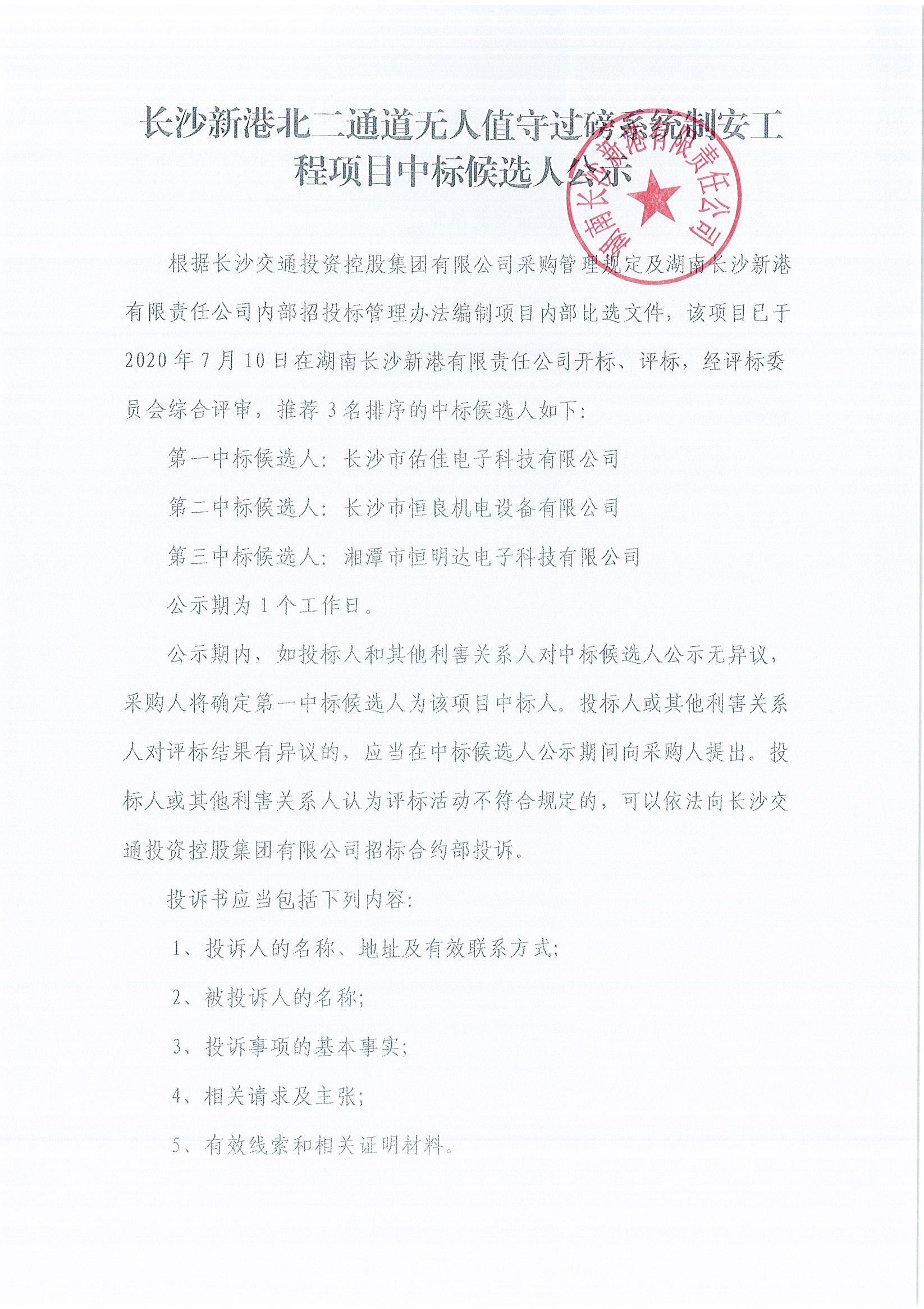 長沙新港北二通道無人值守過磅系統制安工程項目中標候選人公示