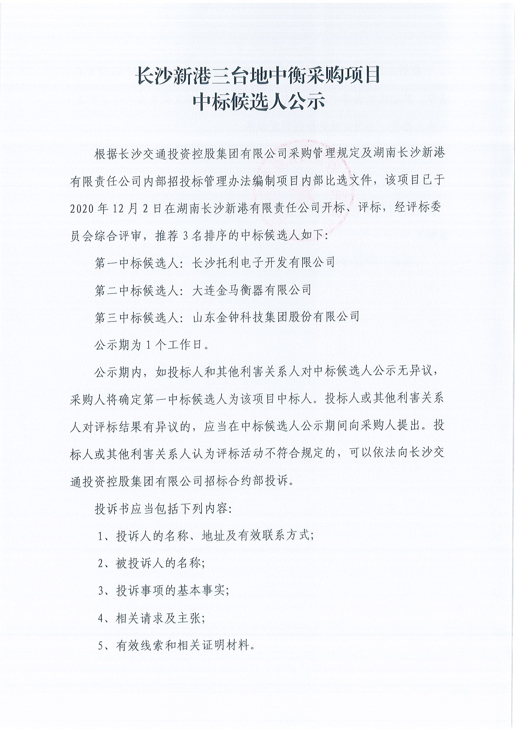 長沙新港三臺地中衡采購項目中標候選人公示