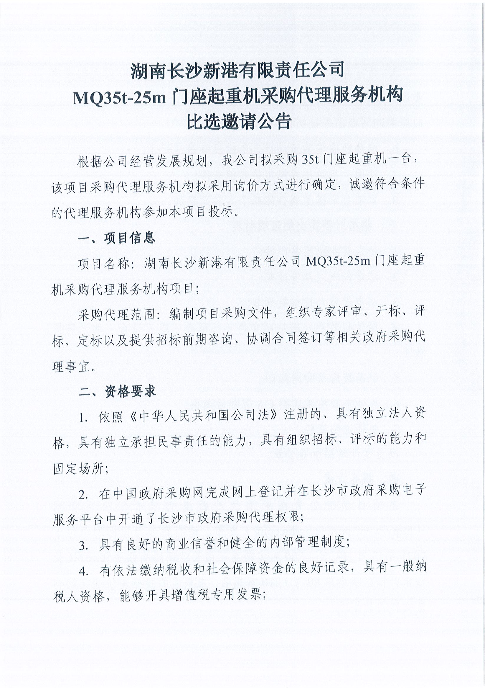 湖南長沙新港有限責任公司MQ35t—25m門座起重機采購代理服務機構比選邀請公告