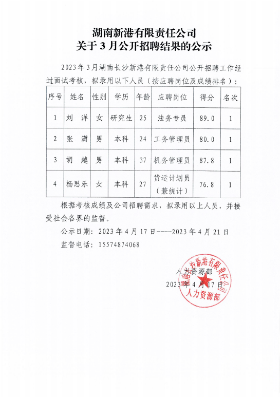 關于3月公開招聘結果的公示