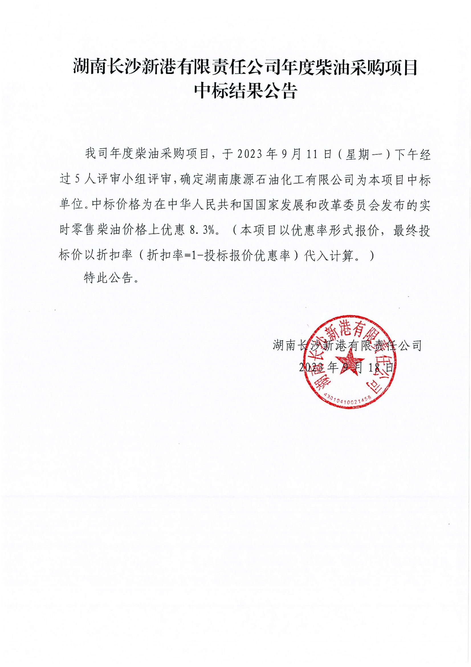 湖南長沙新港有限責任公司年度柴油項目中標結果公告