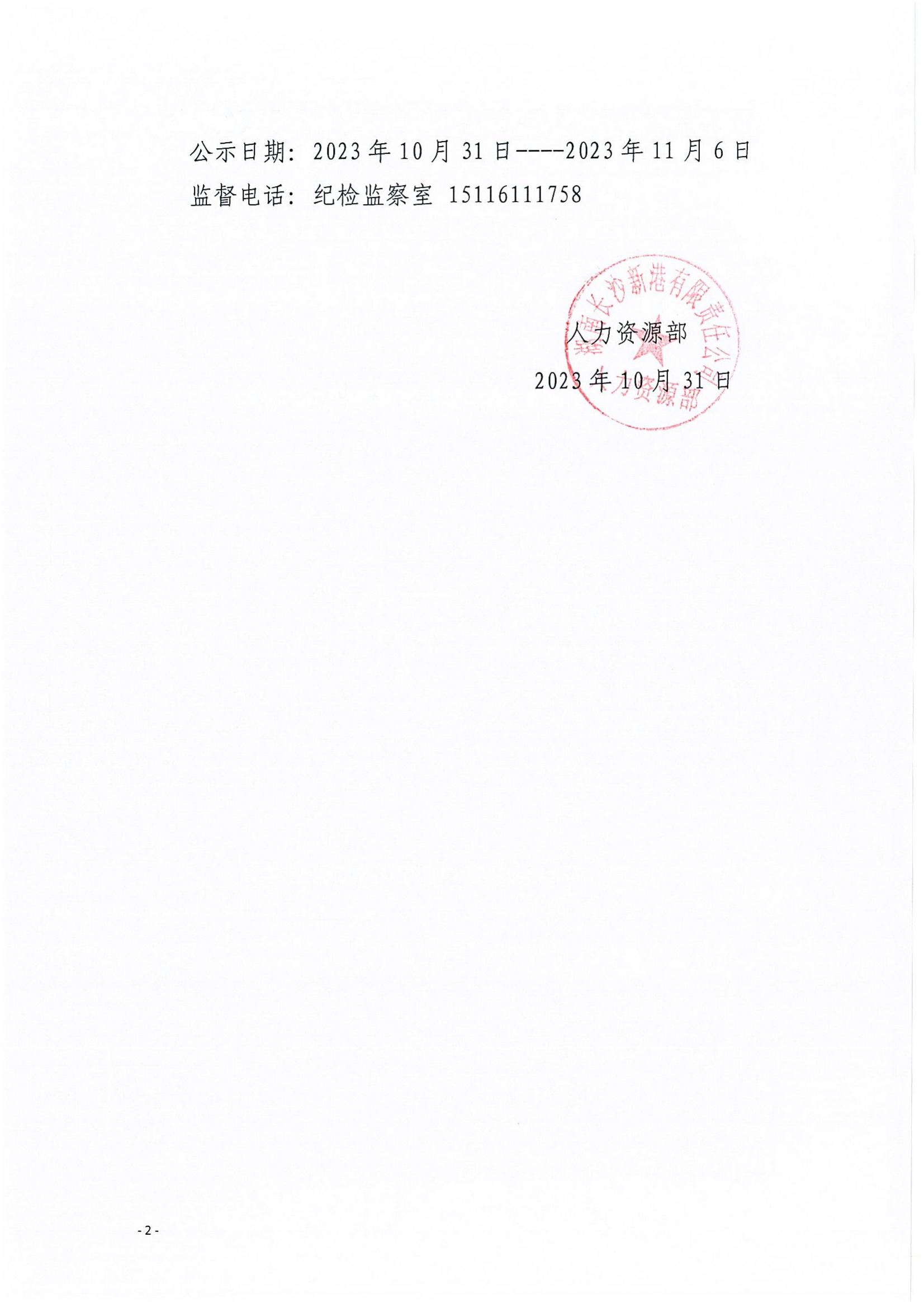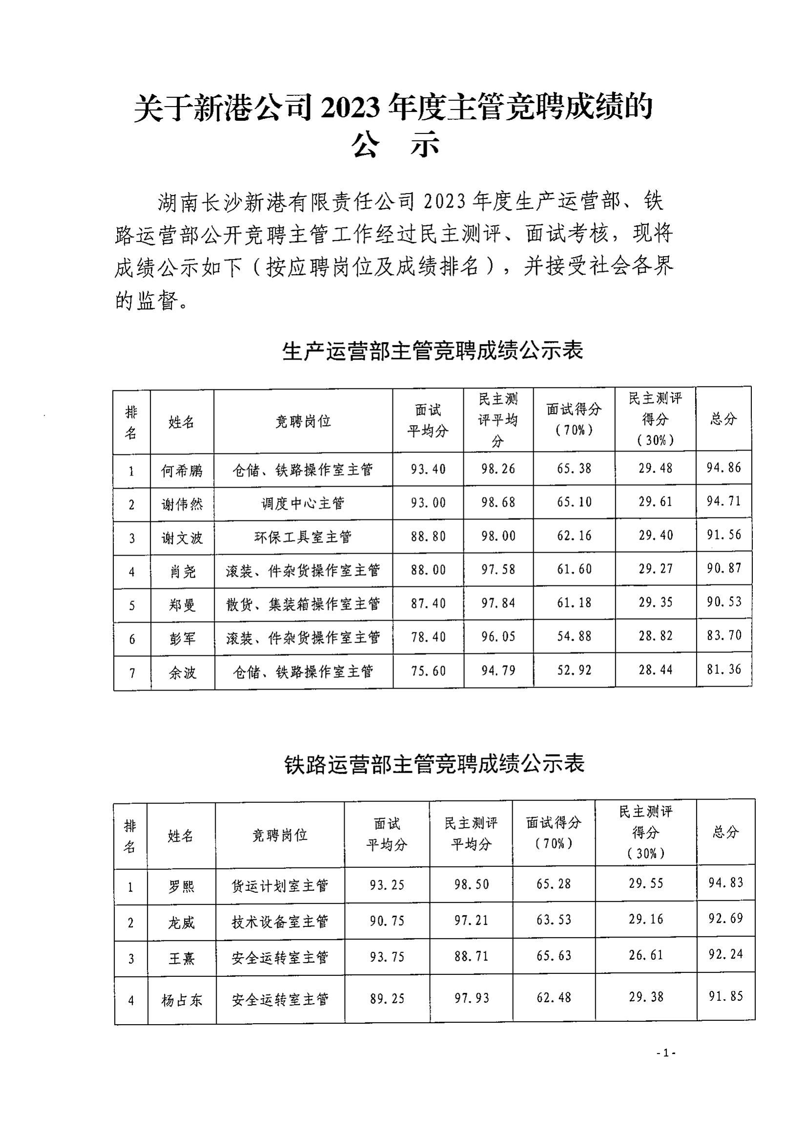 關于新港公司2023年度主管競聘成績的公示