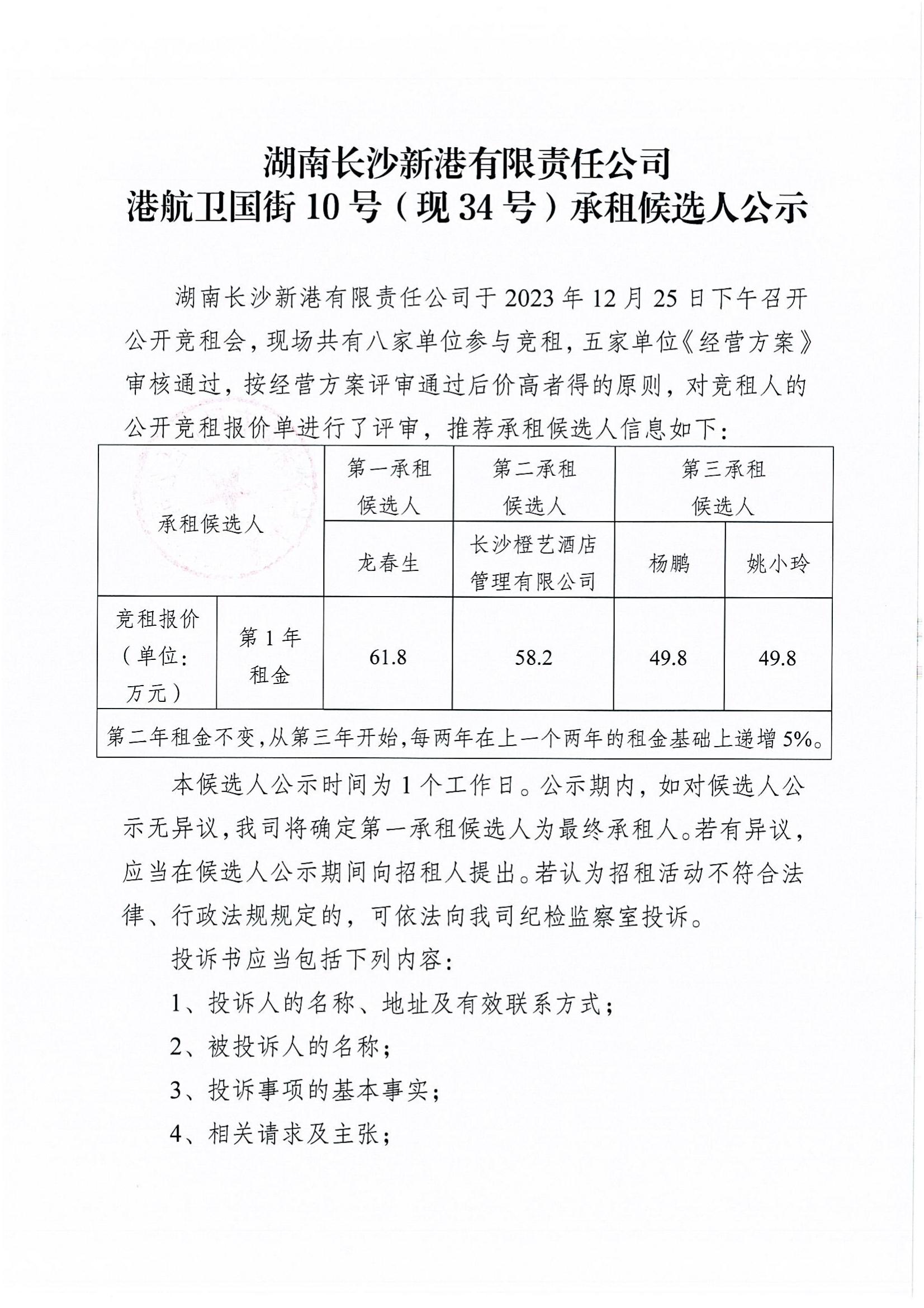 長沙新港港航衛國街10號(現34號)承租候選人公示