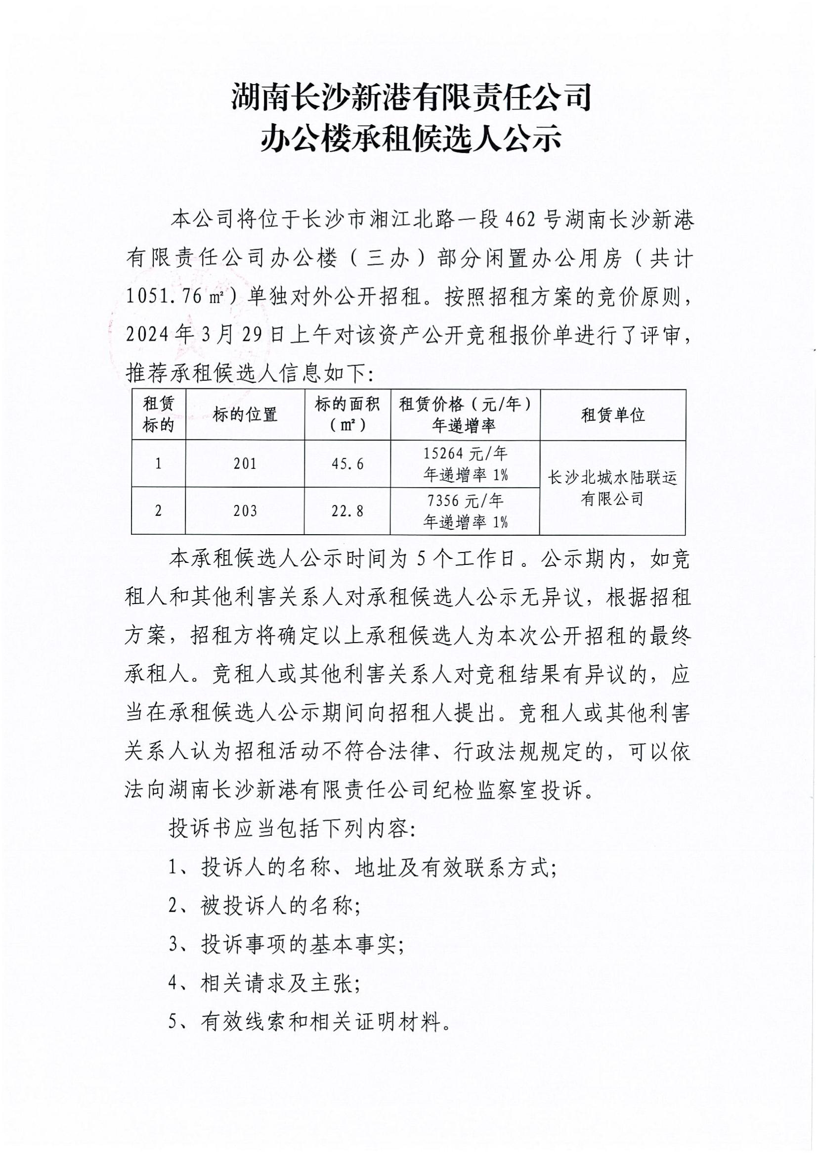 湖南長沙新港有限責任公司辦公樓承租候選人公示(201/203)