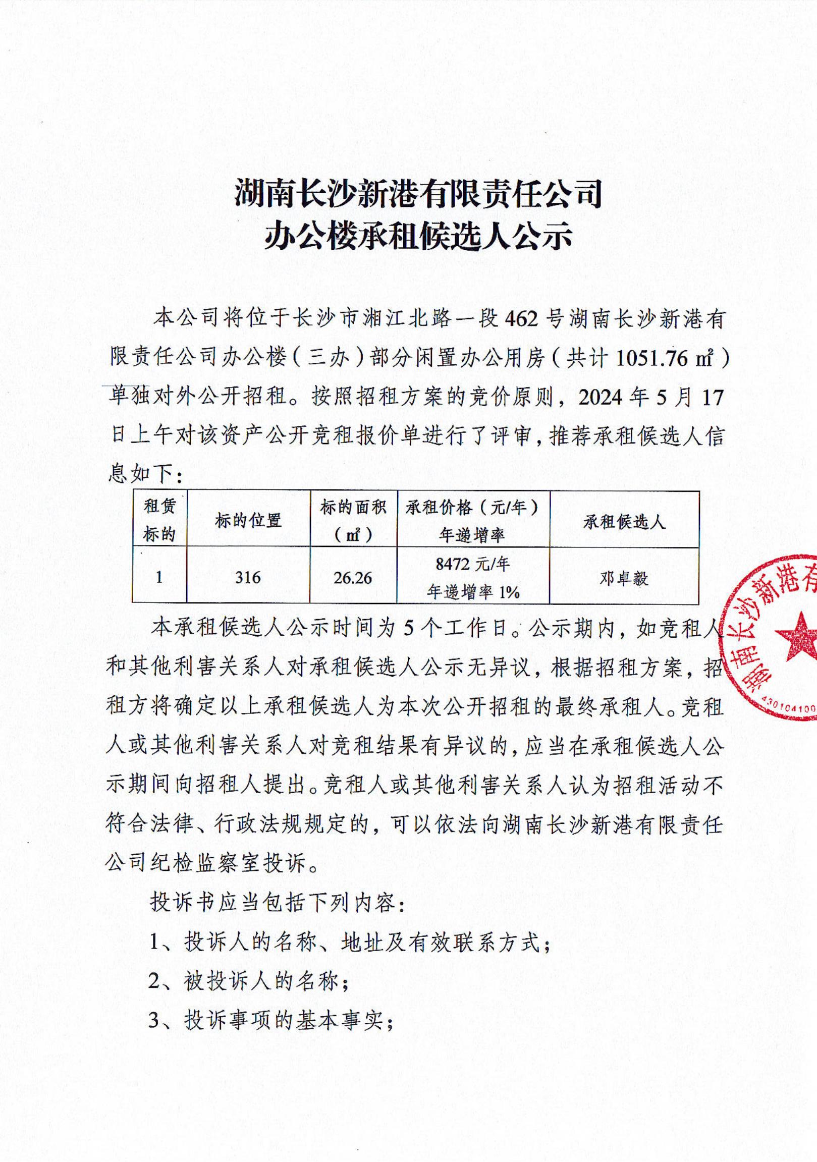 湖南長沙新港有限責任公司辦公樓承租候選人公示