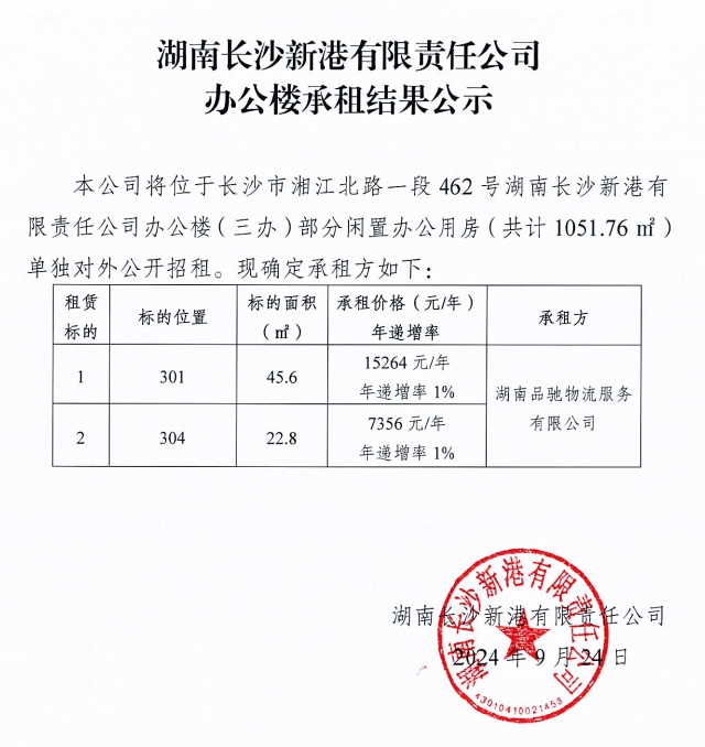 湖南長沙新港有限責任公司辦公樓承租結果公示