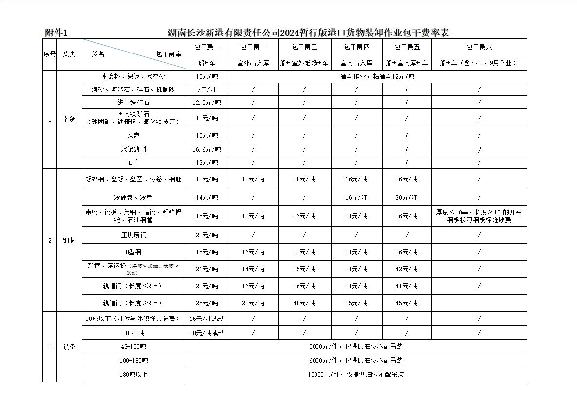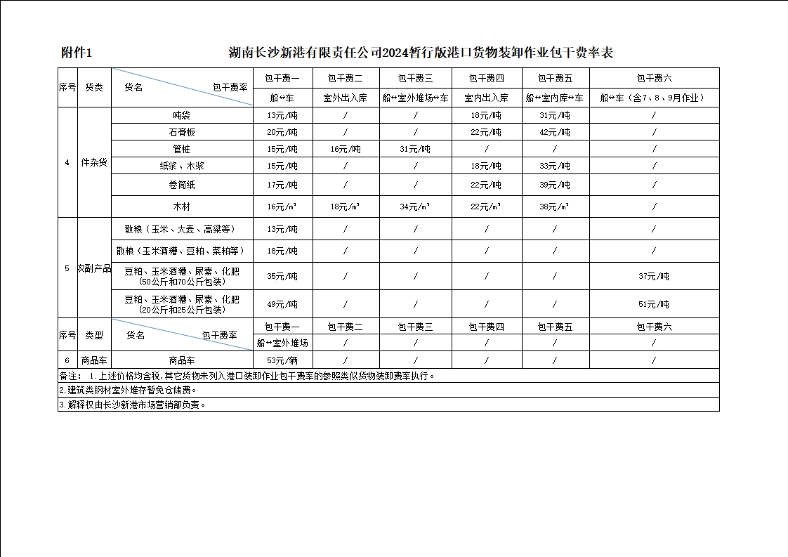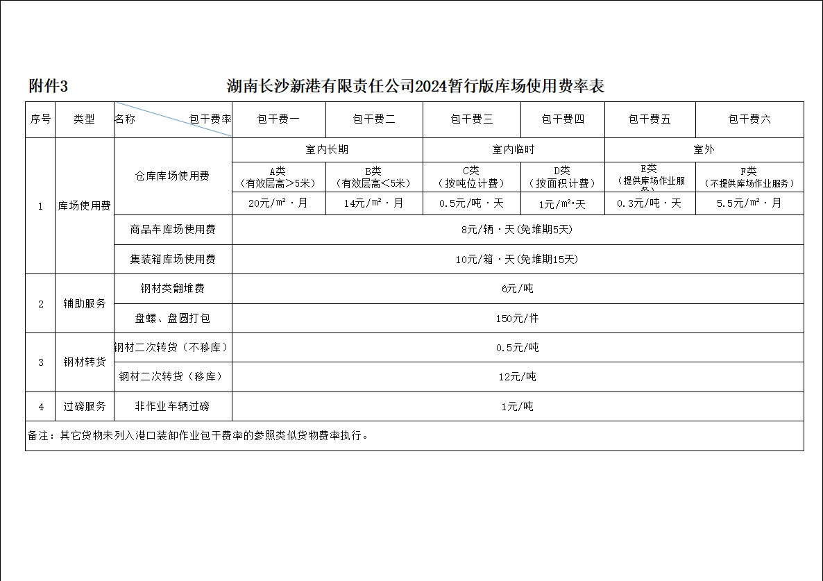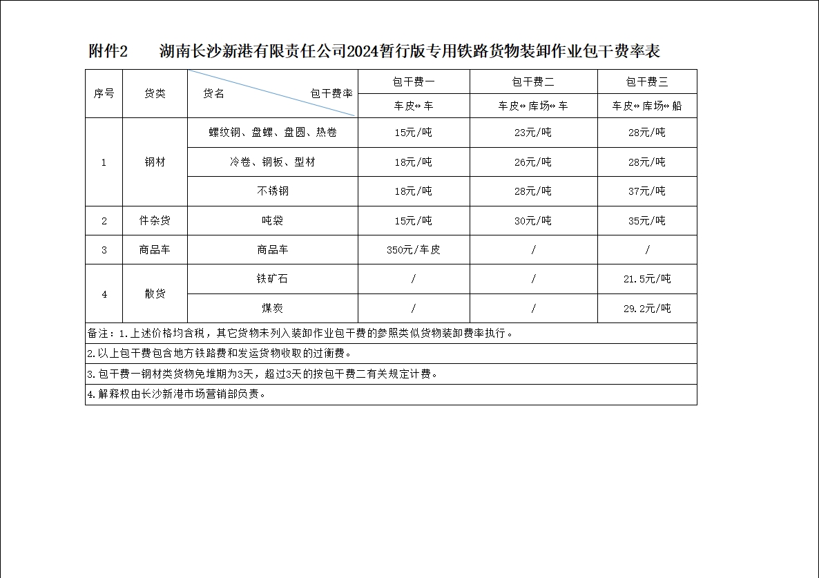 湖南長沙新港有限責任公司2024暫行版港口貨物裝卸作業包干費率、2024暫行版專用鐵路貨物裝卸作業包干費率、2024暫行版庫場使用費率及2024暫行版裝卸作業包干費率階梯價格方案
